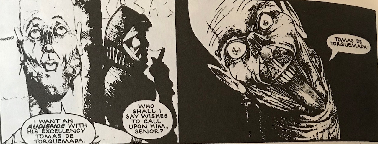 | Why is everyone grimacing and crying? And how has he made the monk look so utterly evil? Words here (and below) by Pat Mills |